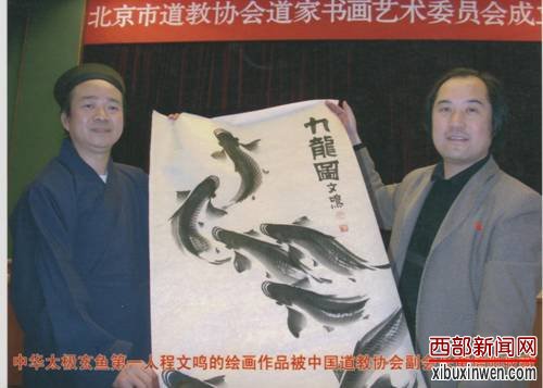 2009年,他则以“著名易学书画家、太极玄鱼始创人”的身份应邀参加在广东省罗浮山观音古寺举行的“弘扬玄奘精神、共建和谐社会”舍利之光新年万民祈福大法会暨西安大雁塔佛教文化珍宝展。并手捧佛珠舍利,恭送三公里。 “佛道融合”国学神韵很快遍及大江南北。