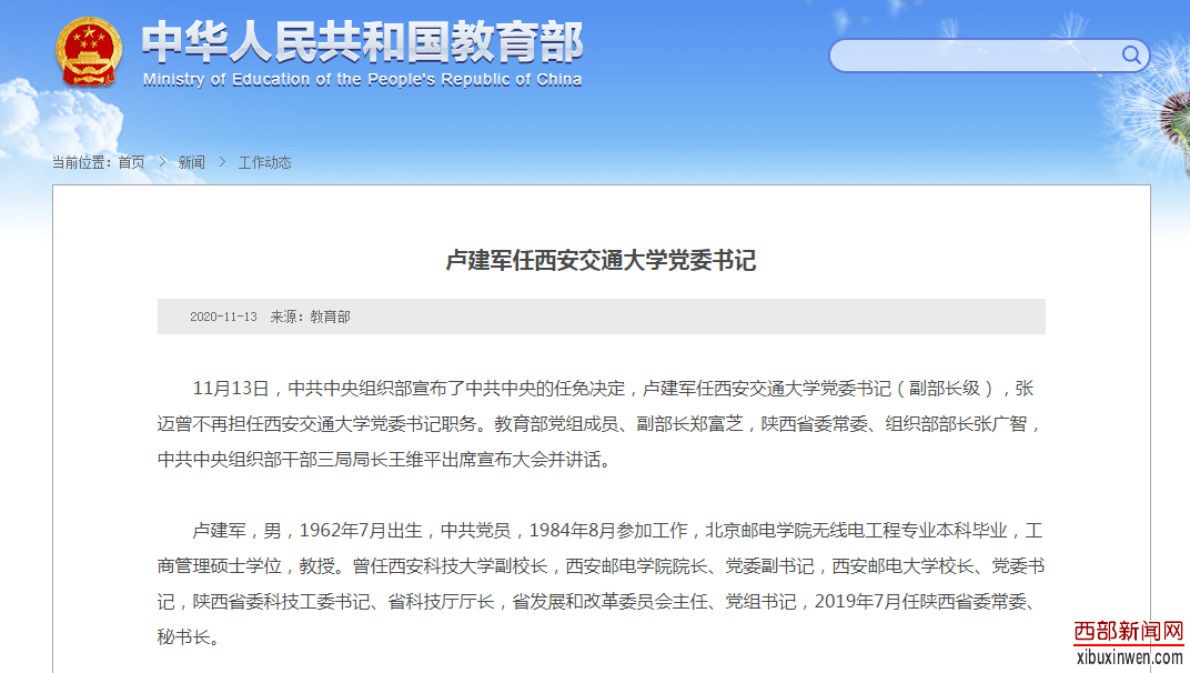 教育部消息:今日(11月13日),中共中央组织部宣布了中共中央的任免决定,卢建军任西安交通大学党委书记(副部长级),张迈曾不再担任西安交通大学党委书记职务。教育部党组成员、副部长郑富芝,陕西省委常委、组织部部长张广智,中共中央组织部干部三局局长王维平出席宣布大会并讲话。