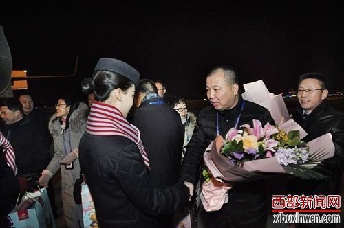 图:深夜21:00,甘肃分公司总经理李友文等领导赴寒风呼啸的机坪,迎接了岁末归来的机组,向他们送上鲜花、糖果和节日的祝福。