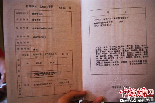 西部新闻网讯 广西北海市一家度假酒店11日“秀”出一本44人共有的房产证,堪称最“牛”房产证。
