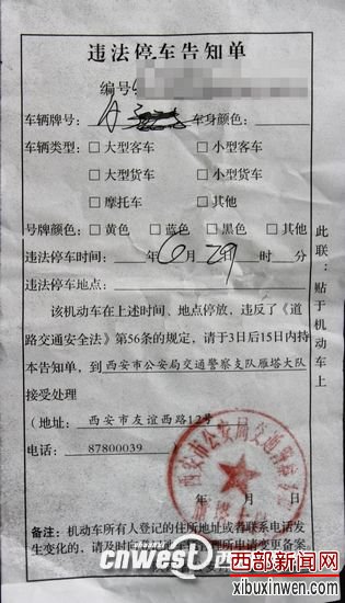 该网友在西部网论坛上发帖说,6月29日下午,在含光路南段收到了一张近似空白的“违法停车告知单”,在这张违停罚单上,只有被交警涂过的车号、违停日期,而车型、违法停车地点、民警签名、罚单日期等等多项内容全是空白,而且停车的地方明明是标准停车位。