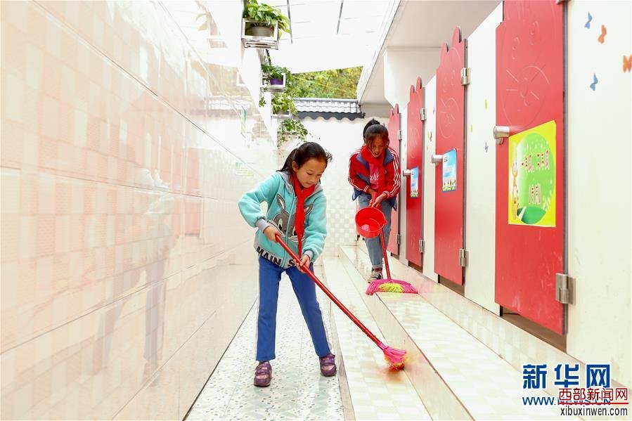 两名学生在贵州省织金县熊家场镇小学的厕所打扫卫生(2018年10月23日摄)。新华社记者 张玉薇 摄
