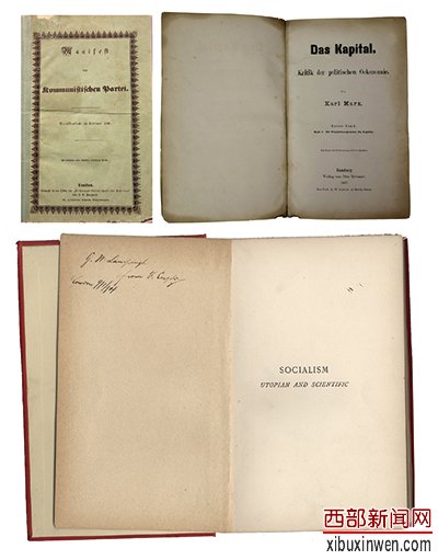 左上图为1848年《共产党宣言》德文第一版。右上图为1867年《资本论》德文第1卷第一版。下图为恩格斯的题字赠书《社会主义从空想到科学的发展》,1892年英文版。 中央党史和文献研究院供图