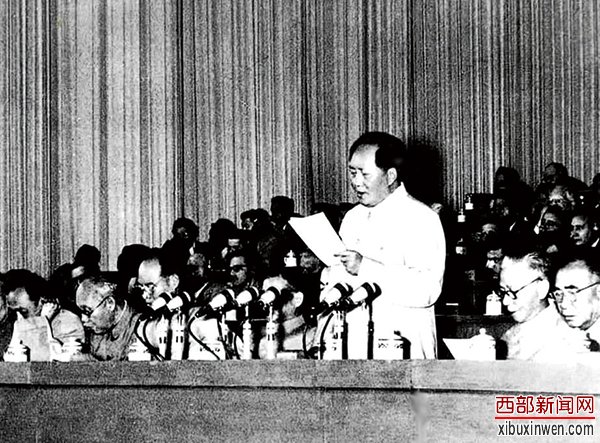 1956年9月15日至27日,中国共产党第八次全国代表大会在北京举行。大会提出的党和国家主要任务是集中力量发展生产力的思想,对于社会主义事业的发展和党的建设具有长远的重要的意义。图为毛泽东在大会上致开幕词。 新华社发