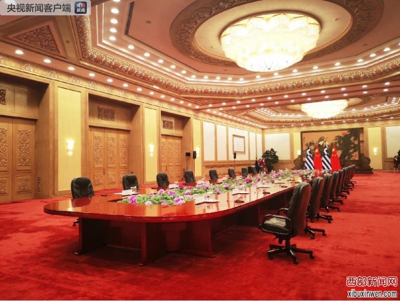 △习近平和希腊总理齐普拉斯在人民大会堂东大厅举行会谈。(央视记者张晓鹏拍摄)