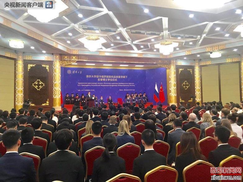 清华大学在这里为普京举行了隆重的仪式,授予他名誉博士学位。