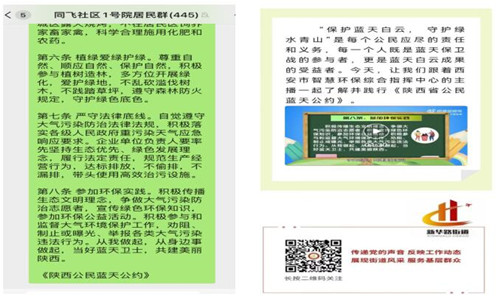 充分利用微信群、公众号、朋友圈、抖音、微视频等多种网络渠道,广泛向辖区居民推送《陕西省公民蓝天公约》及大气污染防治相关法律法规知识,不断扩大宣传覆盖面,增强公众的环境意识、责任意识,强化环境法制观念,在全辖区形成“同呼吸、共奋斗”的价值理念和行为方式,有效提升了宣传影响力。