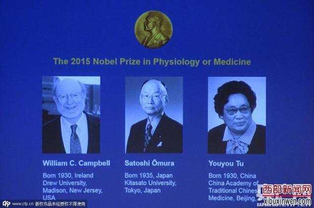 西部新闻网讯 当地时间2015年10月5日,瑞典斯德哥尔摩,诺贝尔委员会举办新闻发布会,宣布2015年诺贝尔生理学或医学奖得主。中国药学家屠呦呦,美国科学家威廉-坎贝尔、日本科学家聪大村分享该奖项。