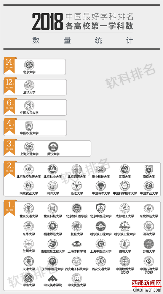 从高校分布看,北京大学是在各学科中夺冠最多的高校,共有14个学科名列榜首。清华大学紧随其后,在12个学科中摘得桂冠。中国人民大学有6个学科排名全国首位,中国农业大学则有4个学科位列全国第一。上海交通大学、武汉大学也有优异表现,在3个学科中拿下“头牌”。全国拥有头名学科的高校,一共是45所。也就是说,93把“交椅”,分给了45所高校。