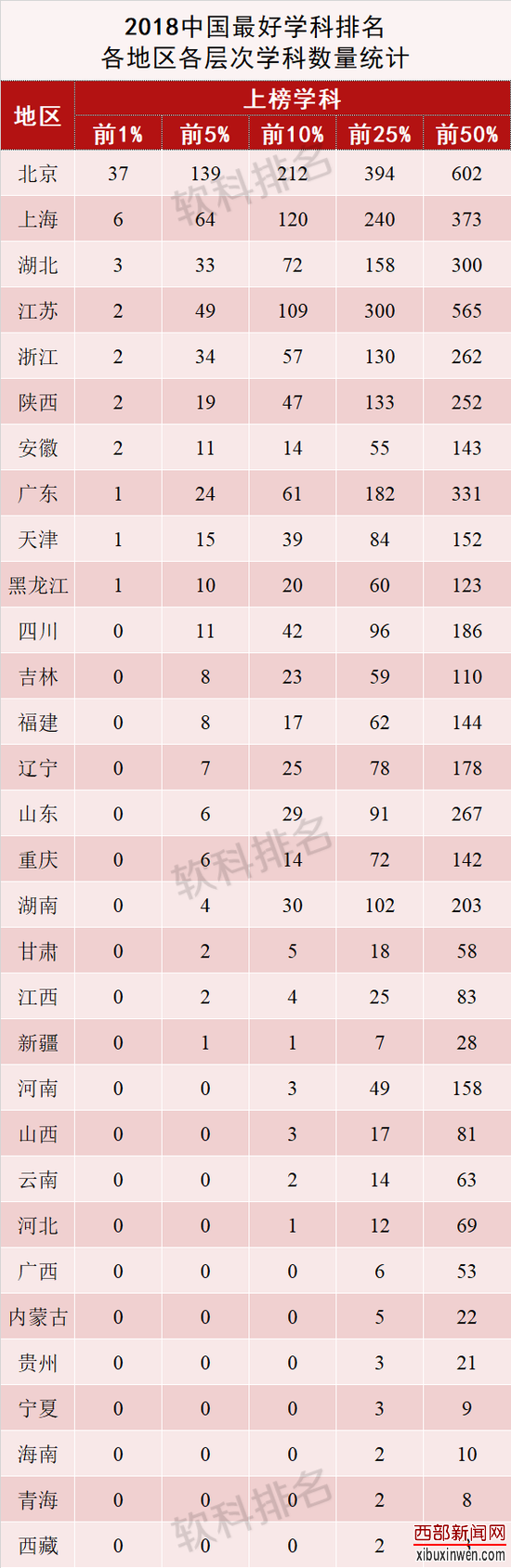 从各省级行政区的上榜学科数量分布看,北京占据绝对优势,从前1%到前50%,在各层次占有的学科数都高居全国第一。上海的前1%学科数、前5%学科数、前10%学科数均位列全国第二,拔尖学科数量优势明显。江苏则在前25%和前50%的学科数仅次于北京,彰显了雄厚的整体实力。湖北、浙江、陕西、广东等省的拔尖学科数量和上榜学科总数,也都处于国内前列。从最顶尖的1%看,是“京一沪二鄂三”。