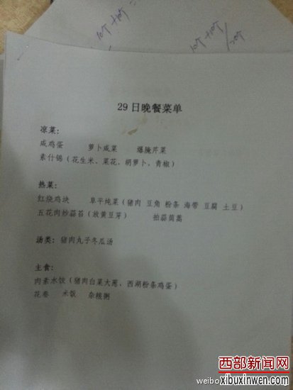 记者在阜平县总书记所住宾馆看到29日总书记一行晚餐餐单——4个热菜:红烧鸡块、阜平炖菜、五花肉炒蒜薹、拍蒜茼蒿;一个猪肉丸子冬瓜汤;主食水饺、花卷、米饭和杂粮粥。特别交代不上酒水。