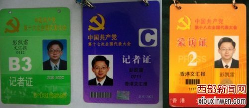 十八大港媒记者证曝光,首标明“香港”界别。图为十六大、十七大、十八大党代会香港媒体记者证对比。香港文汇报记者 王晓雪摄