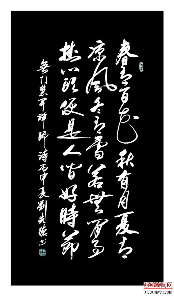 西部新闻网讯 (记者 张龙)著名书法家刘先德先生自幼(学前)遵父教诲,潜心研习书法。初临柳公权《玄秘塔碑》贴近20年,深得“柳字一字值千金”精妙,所书结字严谨,笔法瘦劲,骨力遒健,一丝不苟。后研习欧阳询《九成宫醴泉铭》贴,领悟欧体,用笔方正,高华庄重,打下了坚实的书法基础。自此博览众长,兼修并蓄,渐成一体,尤善行草。