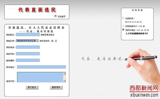 西部新闻网讯( 民主法制网记者 枫露 任文学)为推进党的群众路线教育实践活动的开展,根据党的十八大报告对代表工作的要求,探索代表联系群众的新方式,结合人大工作实际,民主法制网经过精心策划,第一时间在网上推出了“代表直面选民”特色板块。目前,已有11个设区市的多名省人大代表自愿参加了“代表直面选民”活动。活动首日就收到各区域选民建议、意见30余条。为河北省人大代表新添了征集民意平台,成为人大代表践行群众路线的一扇窗口。
