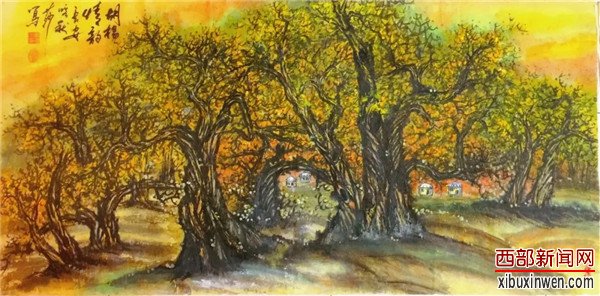其胡杨画博采众长、独具一格,灵妙清新、意趣盎然,她的胡杨画融入了朴拙厚重的笔墨语言与韵致,营造了天地之间的生命景观与精神象征,在形式与内涵的表达中,突显了胡杨树的个人化的情绪性和生命感悟,在“以技入境”的求索中渐行渐远,步步登临,笔下展现出大自然的伟力和不屈不挠、巍然挺拔的英雄精神。她吸收了三维空间写实表现的某些手法,并分寸得当地融入了明暗与光线要素,使笔下胡杨更具视觉震憾力与强大体量感,并在长线、短线和曲线的结合与变化中,演绎出胡杨树干的质感和内涵。李鹏英的胡杨画,讲究构图、布局。无论远近分布、高低错落、大小搭配、疏密相间、动静结合,都既合法度,又独具匠心。一幅幅胡杨画,耐看,耐琢磨,回味无穷,美不胜收。为胡杨画艺术创作增添了新的艺术生命,让中华民族的优秀文化在世界画坛独树一帜。