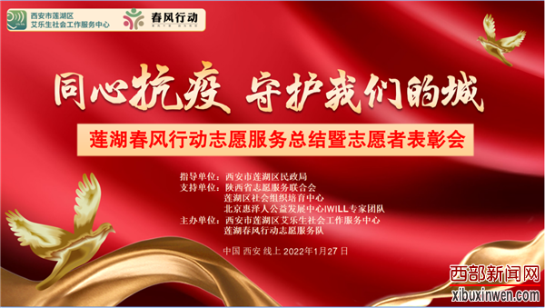 1月27日,在西安市莲湖区民政局的指导下,西安市莲湖区艾乐生社会工作服务中心(以下简称“艾乐生”)召开“同心抗疫,守护我们的城”——莲湖春风行动志愿服务总结暨志愿者表彰会。会议以线上视频会形式,对本次西安抗疫志愿服务中所取得的成效、宝贵经验进行总结分享和志愿者表彰,莲湖区民政局副局长杜敬出席会议并为以后志愿服务指明方向。西部新闻网联合多家媒体重磅聚焦。