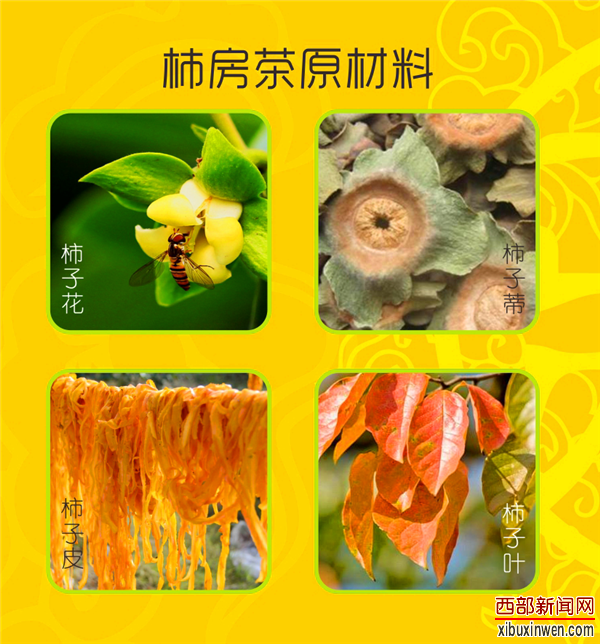 柿子茶是由金瓮山山里50年以上树龄的柿子皮、柿子花、柿子蒂制作,它含有丰富的蛋白质、氨基酸、胡萝卜素、维生素C、核黄素、胆碱、芦丁和丹宁;特别维生素C含量355mg、丹宁含量11590mg.比其它水果及葡萄酒含量高出很多。