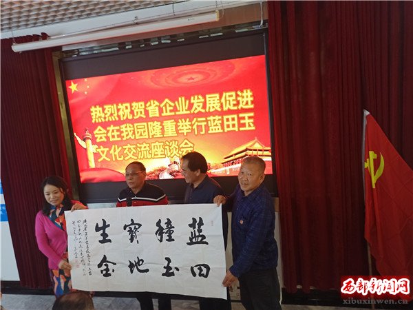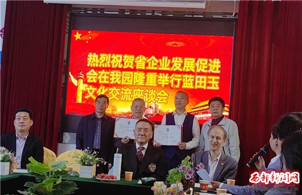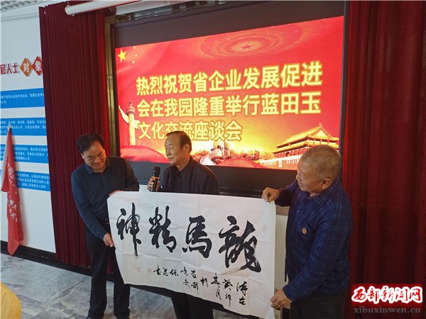 促进会高级顾问赵文艺;高级顾问宁保忠;高级顾问、岭南书画院院长宁学明;促进会文化交流书画院院长赵孝文等艺术家们为西安金鼎蓝田玉石艺园董事长瞿金续赠送书画作品。陕西麒宇酒业董事长付承风将2023元月6号为陕西省企业发展促进会荣誉生产的【国玺·麒宇天赐良缘】酒,赠送给瞿金续董事长,被蓝田玉文化博物馆馆长收藏,青年文化学者、西部新闻网总编辑张龙即兴作诗一首:“企业协会进蓝田,鼎湖美景美名传。润玉石材天下最,麒宇美酒醉长安。”