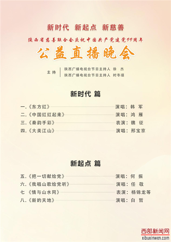 让我们共同期待见证6月30日晚19:30陕西省慈善联合会庆祝“中国共产党建党99周年”慈善助力、文艺扶贫公益直播晚会盛况。