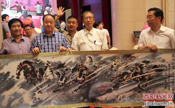 在16日的晚宴上,著名书法家、陕西书法家协会副主席李成海和著名画家、陕西国画院院长范桦等当场挥毫为莫言先生赠送了书画作品。我持着前不久我写的回忆母亲的文章《生命的根》赠送给莫言。我说,任何时候都不能忘记中国和生命的根——祖国和母亲。当他得知这篇回忆文章被《中国报告文学》等多家报刊转载后,兴奋地说:要感恩祖国和母亲,在西安我找到了中国文化的根,他欣然在我《生命的根》一文旁签下他的姓名。这时,西部新闻网总编辑张龙对我说,有一位从西藏归来的擅长画马的著名画家赵喜印要向莫言先生赠送画作,我转告莫言,莫言十分高兴,欣然接受画家绘制的栩栩如生的《天马行空》图,并高兴地同我和画家赵喜印以及大唐西市集团执行总裁李中航一同合影留念。