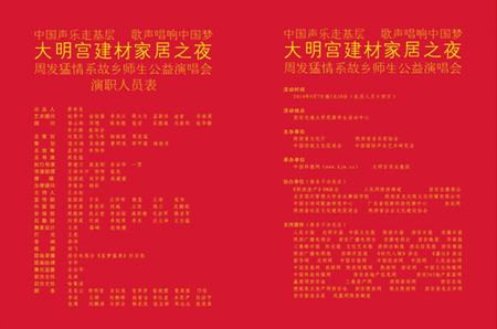 由陕西省文化厅、陕西省音乐家协会、中国传统文化促进会、中国国际声乐艺术研究会联合主办的“中国声乐走基层,歌声唱响中国梦——大明宫建材家居之夜•中国海政文工团陕西安康籍男高音歌唱家、声乐教育家周发猛先生情系故乡师生公益演唱会”,将于2014年9月7日晚,在西安交通大学思源学生活动中心盛大举行。届时将有3000多名社会各界人士获邀到场观看。