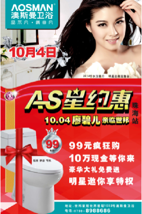 10月4日上午10点,相约珠海世邦家居世界首层,澳斯曼卫浴专卖店,廖碧儿等着你,不见不散!咨询热线:0756-8988686