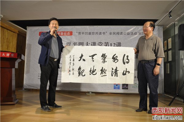 活动上,还播放了张宝通的访谈专题片。鉴于张宝通在“贾平凹邀您共读书”全民阅读公益活动中做出的突出贡献及引领作用,贾平凹文化艺术研究院向张宝通颁发了“读书大使”的荣誉证书和奖杯。著名书法家王斌向张宝通赠送了书法作品。
