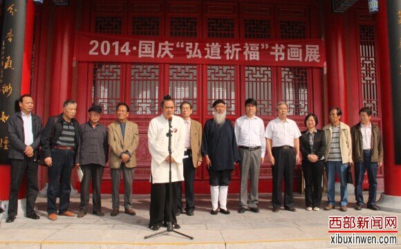 西部新闻网讯(记者 张丽 郑耀成) 9月27日上午,由道教西安青华宫书画院主办的“2014迎国庆弘道祈福书画展”在西安曲江楼观道文化展示区盛大举行,本次活动由国际道教协会会长、西安青华宫住持黄世真担任主持,全国政协常委、中国道教协会会长任法融宣布开幕,并现场泼墨题写“盛世中华”。同时也是道教青华宫和西安曲江楼观道文化展示区联合举办的一次道文化合作活动。