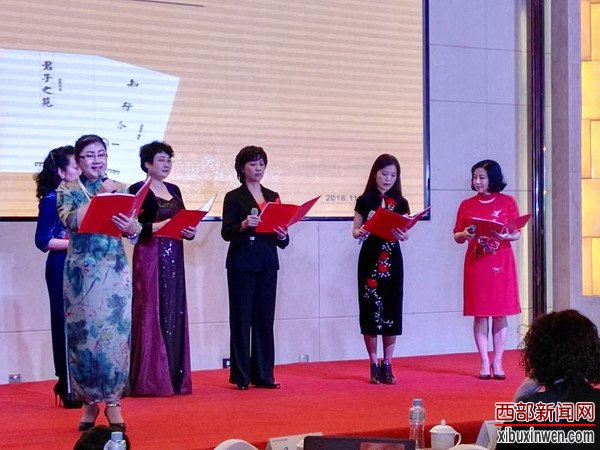 西部新闻网总编辑张龙和著名文化学者为朗诵艺术家海茵和严一宁献花