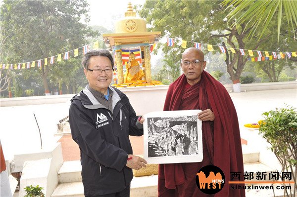 在王舍城竹林精舍,著名文化学者肖云儒发表重要演说并将书法作品“万里皈佛祖 千年传梵音”赠送给大方丈贡多垃,同时将中铁中学版画送给高僧,高僧领众绲诵经并回赠花环!