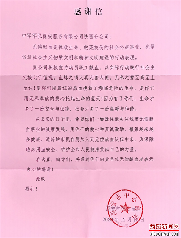 血液,是生命的源泉,是人间传递真情的红色纽带,无偿献血是无私奉献、救死扶伤的崇高行为,是每个公民应尽的责任和义务。为进一步提高中军军弘保安服务有限公司陕西分公司全体员工整体思想觉悟,弘扬奉献社会公益事业精神,树立关心社会服务他人乐于奉献的道德观和价值观,在陕西分公司总经理杨永棋的号召和倡议下,大家踊跃报名,积极参与志愿献血。西部新闻网领衔全国媒体聚焦本次公益献血活动。