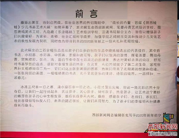 雕琢出美玉,功到自然成。在社会各界的热切期盼中,“成长的力量·首届《陕西娃娃》少儿书画艺术大展”如期开幕了,本次展览由西部新闻网、笔墨丹青艺术培训学校、薇苔鹿鸣美术工坊、九色鹿(乐涂格林)艺术培训学校、正清书院联合主办;旨在以增强孩子们兴趣爱好;为家长、老师、社会汇报所学成果;加强学院之间相互交流和推动少儿文化艺术的良性发展为契机,同时也为即将到来的2020新年献上一份大礼和无限祝福。