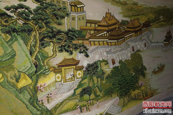 郗女士是宝鸡千阳县人,从小就跟着家人学习针线活,平时缝缝补补的很是熟练,2009年,由于需要照顾孩子,郗女士就辞去工作来到宝鸡,在照顾孩子生活之余,就绣绣市面上火爆的十字绣来消磨时间,像牡丹、八骏图等比较热闹的十字绣,郗女士总是比别人快三倍的时间就能完成。2011年,郗女士就萌生了一个想法,平时都是在绣一些小作品,反正现在自己有时间,何不挑战一下自己?于是,郗女士就网购了市面上最大面积的《清明上河图》来作为挑战的对象。“那时候就觉得自己手工比较熟练,刚拿到清明上河图,厚厚一本书,将近300个分割画面,完工以后拼接成一幅现在的《清明上河图》。”