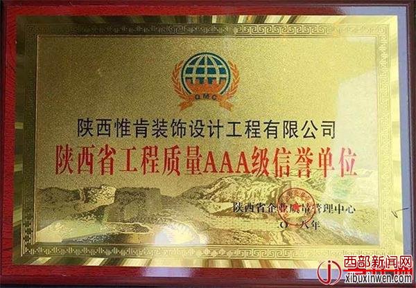 西部新闻网讯(张晓瑞 乔振国)6月13日,惟肯装饰荣获陕西省企业质量管理中心颁发《陕西省工程质量AAA级信誉单位》和《陕西省诚信经营重点推荐单位》两项荣誉称号。