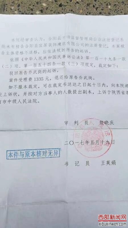 随后,他们出示了一份合阳县人民法院民事裁定书【 (2017)陕0524民初1008号 】 ,这份裁定书明确写道:本院经审查明认为,合阳县市场监督管理局企业注册登记系统未有被告合阳县宜居装饰建筑有限公司的注册登记,本案被告主体资格不适格,应依法驳回原告的起诉,落款时间是2017年5月19日