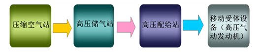 工作过程:压缩空气站----高压储气站------高压配给站-----移动受气设备(高压气动发动机)
