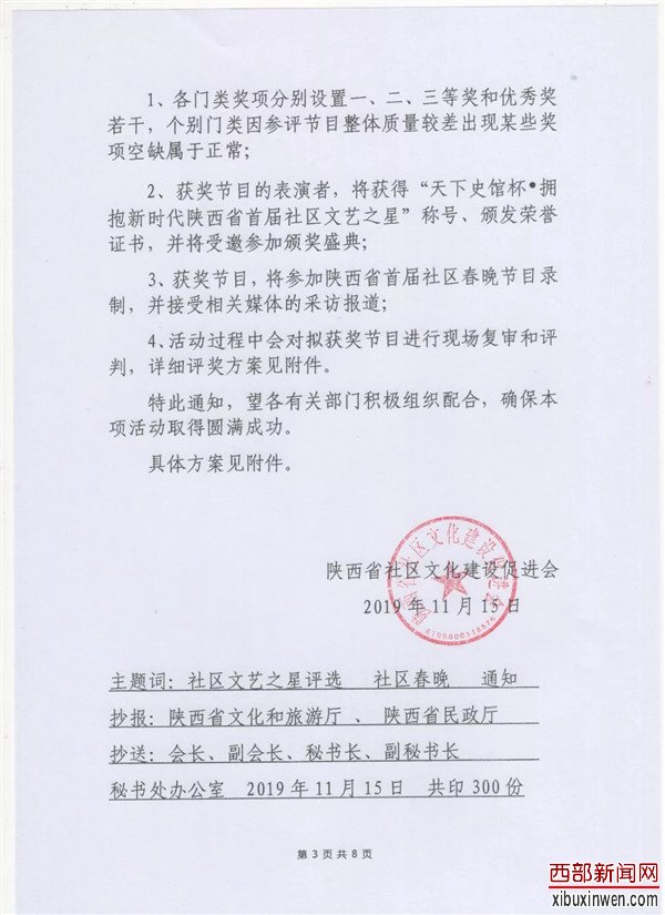 奖项设置和评奖办法:1、各门类奖项分别设置一、二、三等奖和优秀奖若干,个别门类因参评节目整体质量较差出现某些奖项空缺属于正常;2、获奖节目的表演者,将获得“天下史馆杯•拥抱新时代陕西省首届社区文艺之星”称号、颁发荣誉证书,并将受邀参加颁奖盛典;3、获奖节目,将参加陕西省首届社区春晚节目录制,并接受相关媒体的采访报道;4、活动过程中会对拟获奖节目进行现场复审和评判,详细评奖方案见附件。特此通知,望各有关部门积极组织配合,确保本项活动取得圆满成功。