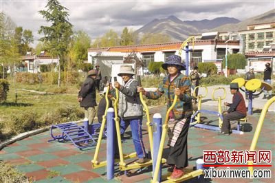 图为拉萨市达孜区金叶敬老院的老人们聚在一起在健身场所锻炼身体。记者 王莉 摄