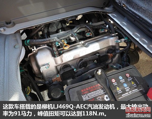 动力方面,这款车搭载的是柳机LJ469Q-AEC汽油发动机,最大输出功率为67KW,最大91马力,峰值扭矩可以达到118N.m,达到了国六排放标准,与之匹配的是5挡变速箱。