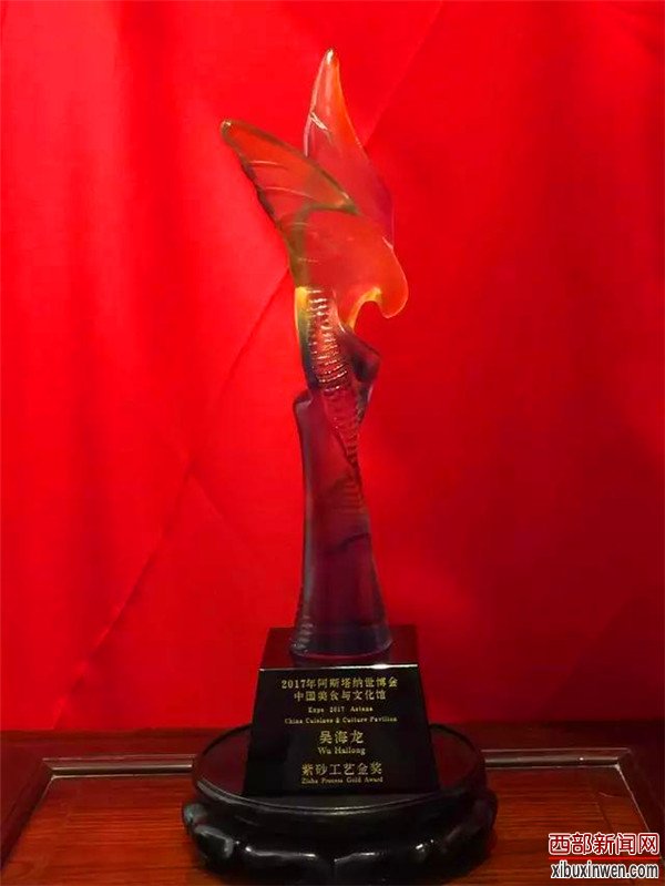 西部新闻网讯 (记者 张丽)2017年,中国升起了一颗紫砂文化艺术之星,这颗星冉冉升起,不仅照亮了中国,也照亮了世界。提起星,人们想到的多是影视明星和歌曲明星,其他艺术类的明星甚少,更想不到小小紫砂壶也能捧起一颗星。吴海龙先生就是凭借着精益求精的工匠精神,获得了哈萨克斯坦“2017阿斯塔纳世博会中国美食与文化馆紫砂工艺金奖”,创造了紫砂之星。消息传来,举国沸腾,各家媒体竞相报道。