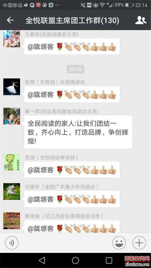 西部新闻网讯 (记者 张龙)8月13日晚上八点,全国全民阅读会全国各地主席群主席团召开“全悦联盟干部大会”,认真听取联盟副主席张培合同志的演讲。演讲长达1小时。其惊人的脱口演讲受到了大家的广泛好评,演讲取得圆满成功!