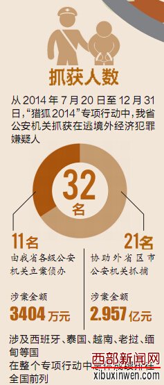 西部新闻网讯(记者杨阳)“在国内过着优越的生活,逃亡海外后却是如此的窘迫不堪。白天不敢与人接触,晚上夜不能寐,一天干12个小时只有约50元的报酬!”这是一名被劝返人员的心声,6年时间不长,但他从一名帅气青年变成了满头白发的“老人”。5月20日,记者从省公安厅获悉,在“猎狐2014”行动中,我省公安机关分别从西班牙、泰国、越南、老挝、缅甸等国抓获在逃境外经济犯罪嫌疑人32名。而目前,“猎狐2015”行动已拉开大幕,今年的重点追逃对象不仅包括外逃经济嫌犯,还有外逃国家工作人员以及涉腐案件外逃人员等。